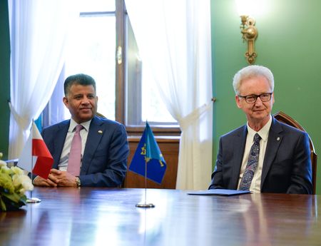 Spotkanie rektora Uniwersytetu Jagiellońskiego prof. Jacka Popiela z ambasadorem Królestwa Arabii Saudyjskiej w Polsce Saadem Salehem Al-Salehem było głównym punktem wizyty saudyjskiej delegacji w murach najstarszej polskiej uczelni. Goście z Półwyspu Arabskiego zwiedzili także reprezentacyjne budynki Collegium Novum oraz Collegium Maius.